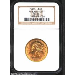 1881 $10 MS64 NGC. With sharp striking definition and billowy mint frost, this high quality Eagle is almost certainly bound for inclusion in a near-Gem type set. Lovely golden-rose color envelops both sides with the occasional suggestion of deeper reddish-gold patina. The number of scattered abrasions is minimal for the type. Despite its status as a generic date, the 1881 is not at all common in the finer Mint State grades. NGC and PCGS combined report 32 coins in MS64 with a lone MS65 PCGS specimen finer (10/02).From the Ashland City Collection. Important notice: We expect to be auctioning lots at the rate of 200-250 per hour. Sometimes eBay Premier live bid software cannot keep up with that pace, so we strongly recommend that you place a realistic proxy bid now as insurance to avoid disappointment. Also please note that all Heritage/CAA lots purchased through eBay Premier carry a 20% Buyer's Premium. Please make sure you read the Terms and Conditions.