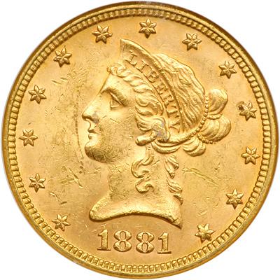 1881 $10. NGC graded MS-62. Frosty, with a touch of subtle toning here and there on both sides.