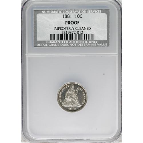 <B>1881 10C --Improperly Cleaned--NCS. Proof.</B></I> NGC Census: (0/0). PCGS Population (0/0). Mintage: 975. (#4778)<BR><BR><b>Shipping:</b> Coins & Currency (<a target="_blank" href="http://www.heritageauctions.com/common/shipping.php">view shipping information</a>)