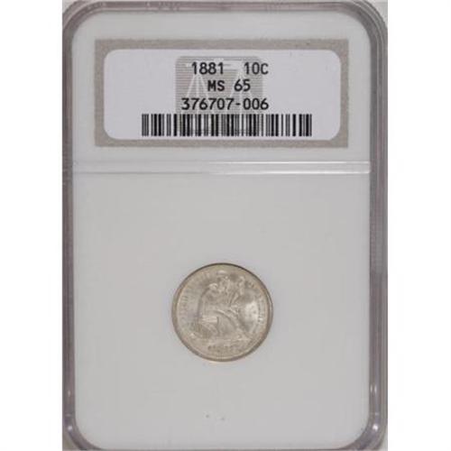 <B>1881 10C MS65 NGC.</B></I> Well-defined and wonderfully frosty with pale silver-white surfaces. Undeniably appealing beneath whispers of haze that visit each side. Census: 11 in 65, 8 finer (2/08).<BR><I>From The Chippewa Valley Collection.</B></I><BR><BR><B>Coin Engraver:</B> Christian Gobrecht<BR><BR><b>Shipping:</b> Coins & Currency (<a target="_blank" href="http://www.heritageauctions.com/common/shipping.php">view shipping information</a>)