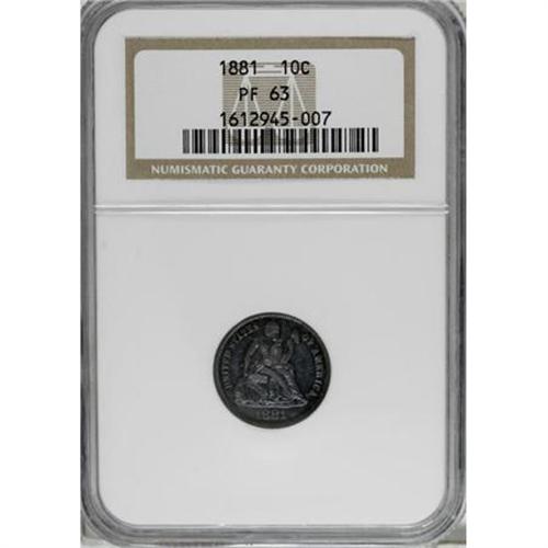 <B>1881 10C PR63 NGC.</B></I> NGC Census: (19/143). PCGS Population (57/115). Mintage: 975. Numismedia Wsl. Price for NGC/PCGS coin in PR63: $500. (#4778)<BR><BR><B>Coin Engraver:</B> Christian Gobrecht<BR><BR><b>Shipping:</b> Coins & Currency (<a target="_blank" href="http://www.heritageauctions.com/common/shipping.php">view shipping information</a>)