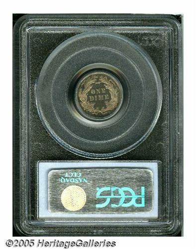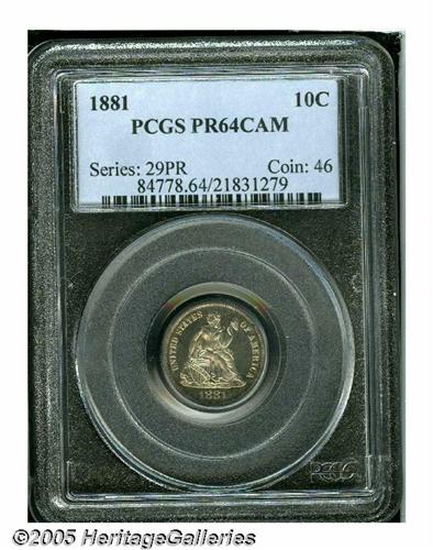 <B>1881<10C> PR64 Cameo PCGS.</B></I> Dappled cobalt-blue and lilac patina dances over luminous proof surfaces. Exquisitely struck, and a few minor marks on Liberty's portrait. Just 975 pieces were issued, along with a mere 24,000 business strikes. Population: 8 in 64, 10 finer (4/05).