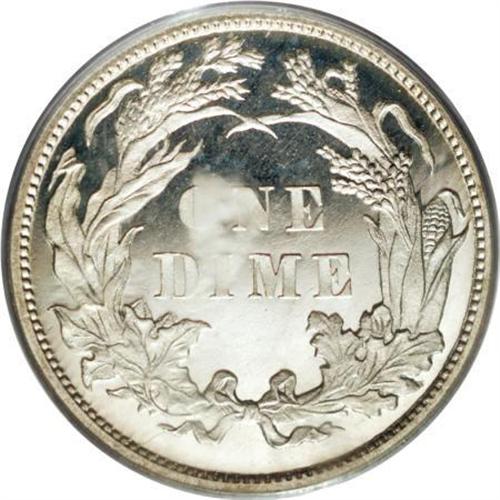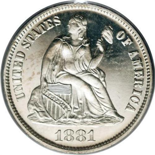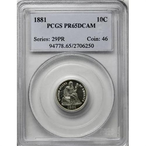 <B>1881 10C PR65 Deep Cameo PCGS.</B></I> The obverse has an occasional dash of golden-tan patina. An impressive Gem that has a good strike and pleasing surfaces. Just 975 proofs were struck, and the business strike production is also very low. Population: 1 in 65 Deep Cameo, 2 finer (11/07).<BR><BR><b>Shipping:</b> Coins & Currency (<a target="_blank" href="http://www.heritageauctions.com/common/shipping.php">view shipping information</a>)