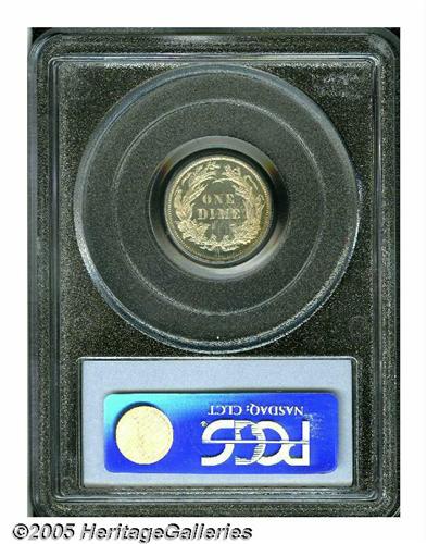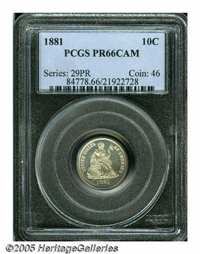 <B>1881<10C> PR66 Cameo PCGS.</B></I> A near-brilliant Premium Gem with just a hint of faint gold color, and that has irrefutable cameo contrast. The design features are exquisitely struck. A couple of tiny marks on the lower reveres are mentioned for accuracy. Less than 1,000 proofs were struck, and the business strike mintage was also very low (24,000 pieces). Population: 5 in 66, 1 finer (4/05).