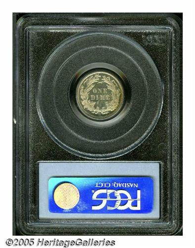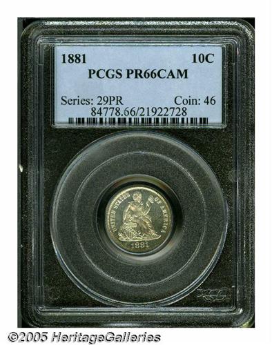 <B>1881<10C> PR66 Cameo PCGS.</B></I> A near-brilliant Premium Gem with lovely faint gold color, and irrefutable cameo contrast. The design features are exquisitely struck. A couple of tiny marks on the lower reveres are mentioned for accuracy. Less than 1,000 proofs were struck, and the business strike mintage was also very low (24,000 pieces). Population: 5 in 66, 1 finer (6/05).