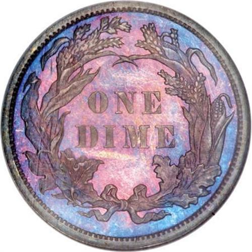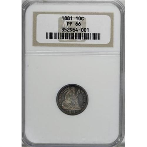 <B>1881 10C PR66 NGC.</B></I> The paltry original mintage of the business strike 1881 should ensure significant bidder competition for this high quality proof. Both sides present a markedly different "look," the obverse being predominantly golden-gray in appearance with dappled electric-blue and reddish-lilac rim highlights. The reverse is more deeply toned in lavender-copper hues with vibrant undertones. Sharply impressed, as expected of a proof striking. Census: 28 in 66, 14 finer (10/07).<BR><BR><B>Coin Engraver:</B> Christian Gobrecht<BR><BR><b>Shipping:</b> Coins & Currency (<a target="_blank" href="http://www.heritageauctions.com/common/shipping.php">view shipping information</a>)