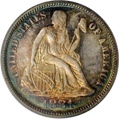 <B>1881 10C PR66 PCGS.</B></I> Golden-gray centers are framed by cobalt-blue, lavender, and yellow-gold toning at the margins. An attentive strike leaves well defined devices, enhancing the coin's eye appeal. Both faces have been well cared for. Population: 10 in 66, 4 finer (8/07).<I><BR>From The Beau Clerc Collection.</B></I><BR><BR><B>Coin Engraver:</B> Christian Gobrecht<BR><BR><b>Shipping:</b> Coins & Currency (<a target="_blank" href="http://www.heritageauctions.com/common/shipping.php">view shipping information</a>)