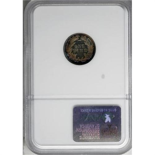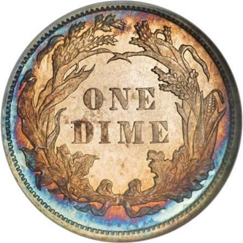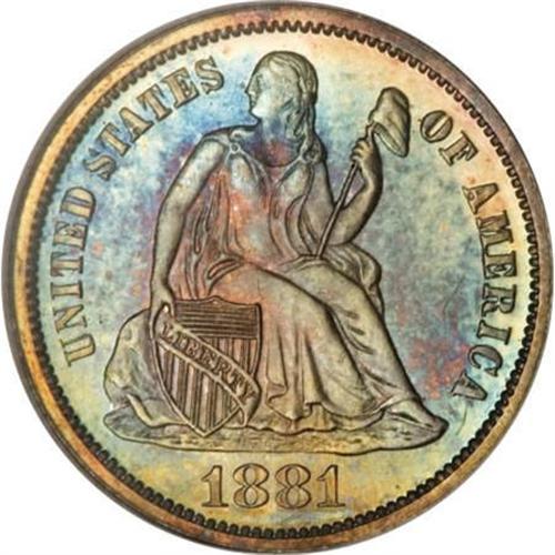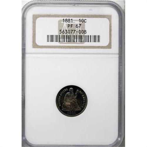 <B>1881 10C PR67 NGC.</B></I> Both sides are overlaid in steel-blue and sunset-golden patina, a bit lighter on the reverse. The fields are fully reflective, providing lots of eye appeal on this hairline-free example. A popular date due to the low business strike mintage. Census: 12 in 67, 2 finer (12/07).<BR><BR><B>Coin Engraver:</B> Christian Gobrecht<BR><BR><b>Shipping:</b> Coins & Currency (<a target="_blank" href="http://www.heritageauctions.com/common/shipping.php">view shipping information</a>)