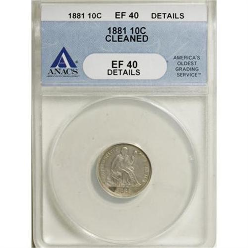 <B>1881 10C --Cleaned--ANACS. XF40 Details.</B></I> NGC Census: (0/54). PCGS Population (4/61). Mintage: 24,000. Numismedia Wsl. Price for NGC/PCGS coin in XF40: $300. (#4689)<BR><BR><B>Coin Engraver:</B> Christian Gobrecht<BR><BR><b>Shipping:</b> Coins & Currency (<a target="_blank" href="http://www.heritageauctions.com/common/shipping.php">view shipping information</a>)