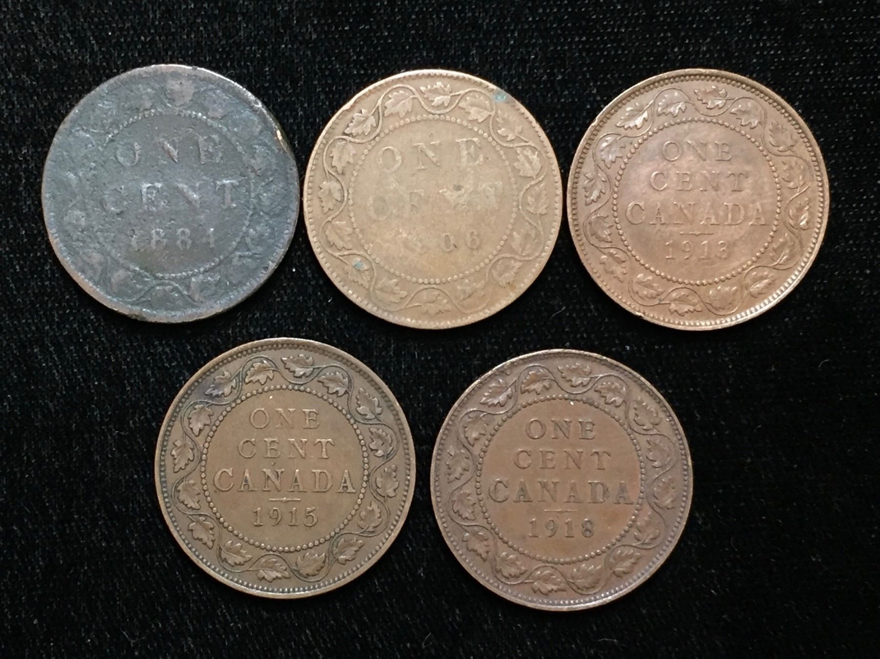 Lot 199; Group of 5 Canada Large One Cent, 1881 Queen Victoria, 1906 King Edward VII, 1913, 1915, 1918 King George V