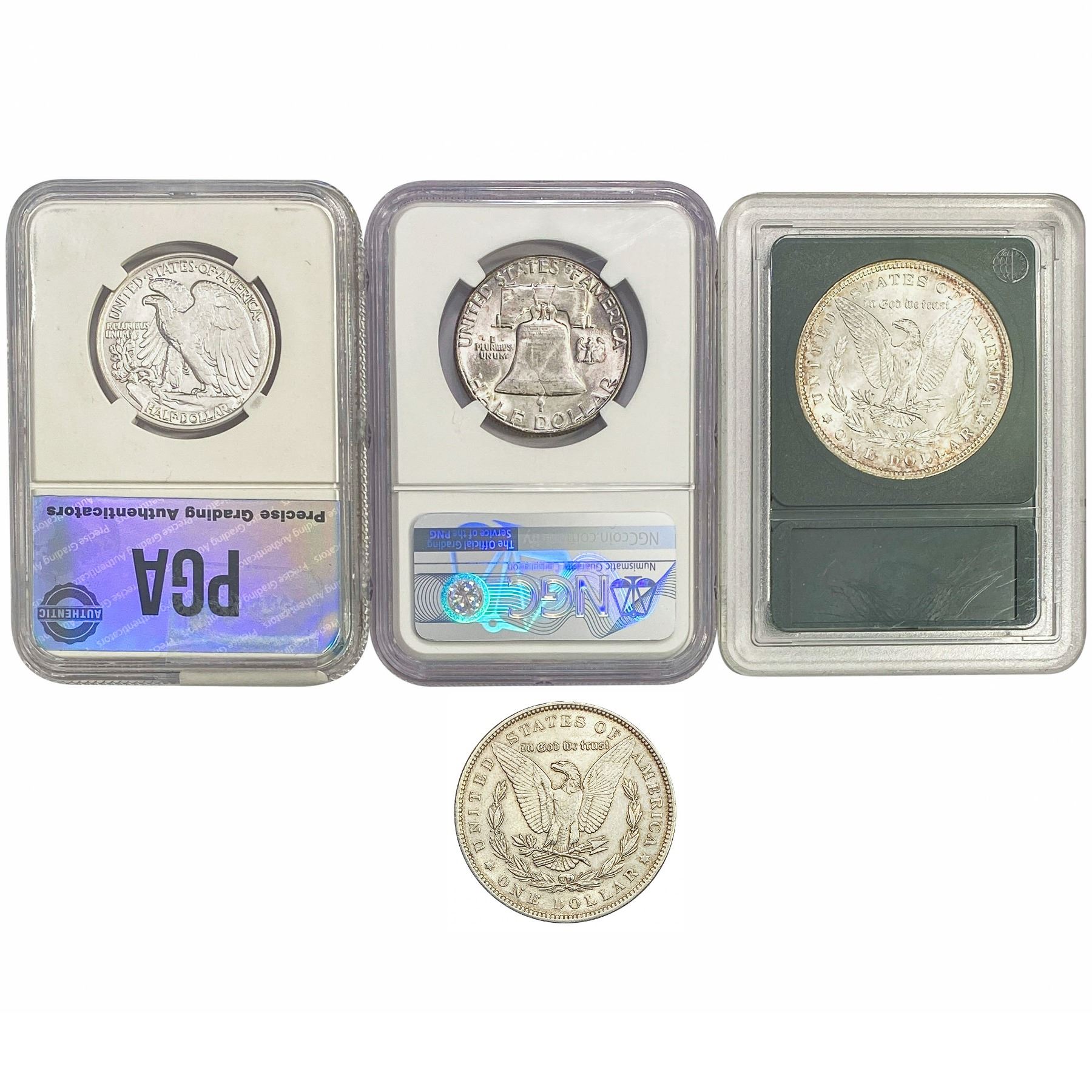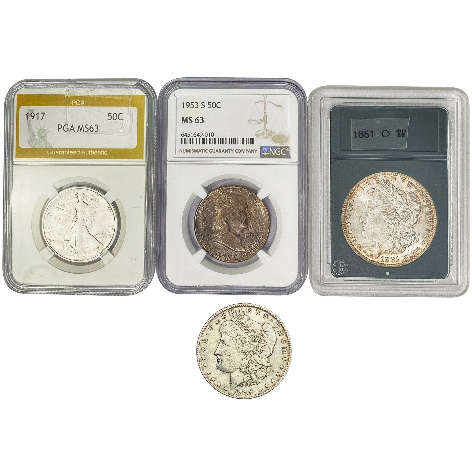 COINS AND CURRENCY LISTED IN GSA’S CATALOG AS GRADED AND ENCAPSULATED BY PCGS, NGC, ANACS, ICG, PCGS CURRENCY, PMG, PCGS BANKNOTE GRADING, CMC OR ANY OTHER THIRD-PARTY GRADING SERVICE ARE LIKEWISE SOLD “AS-IS” EXCEPT AS EXPRESSLY SET FORTH HEREIN. ALL THIRD-PARTY GRADING SERVICE GUARANTEES, INCLUDING AUTHENTICITY, ARE THE SOLE RESPONSIBILITY OF THE THIRD-PARTY GRADING SERVICE AND NOT WARRANTIES OR GUARANTEES OF GSA. BIDDERS SHOULD CONTACT THESE THIRD-PARTY GRADING SERVICES DIRECTLY WITH RESPECT TO ANY CLAIMS OR QUESTIONS THEY MAY HAVE CONCERNING THEIR GUARANTEES AND WARRANTIES. BIDDERS ACKNOWLEDGE AND AGREE THAT AUCTIONEER IS NOT BOUND BY OR LIABLE FOR ANY OPINION OR CERTIFICATION BY ANY THIRD-PARTY GRADING SERVICE. REMOVAL OF A PRODUCT FROM ITS PROTECTIVE CASING OR HOLDER OR ALTERATION OF ANY COIN HOLDER WAIVES ALL RIGHTS CONCERNING THE PRODUCT CONTAINED THEREIN.