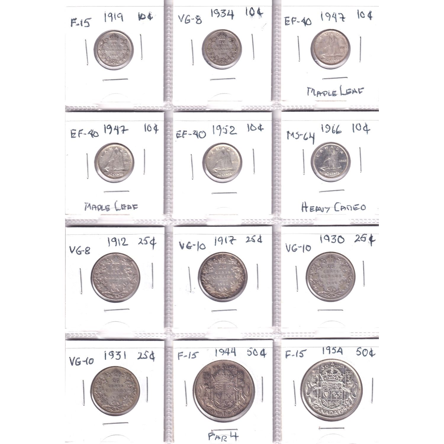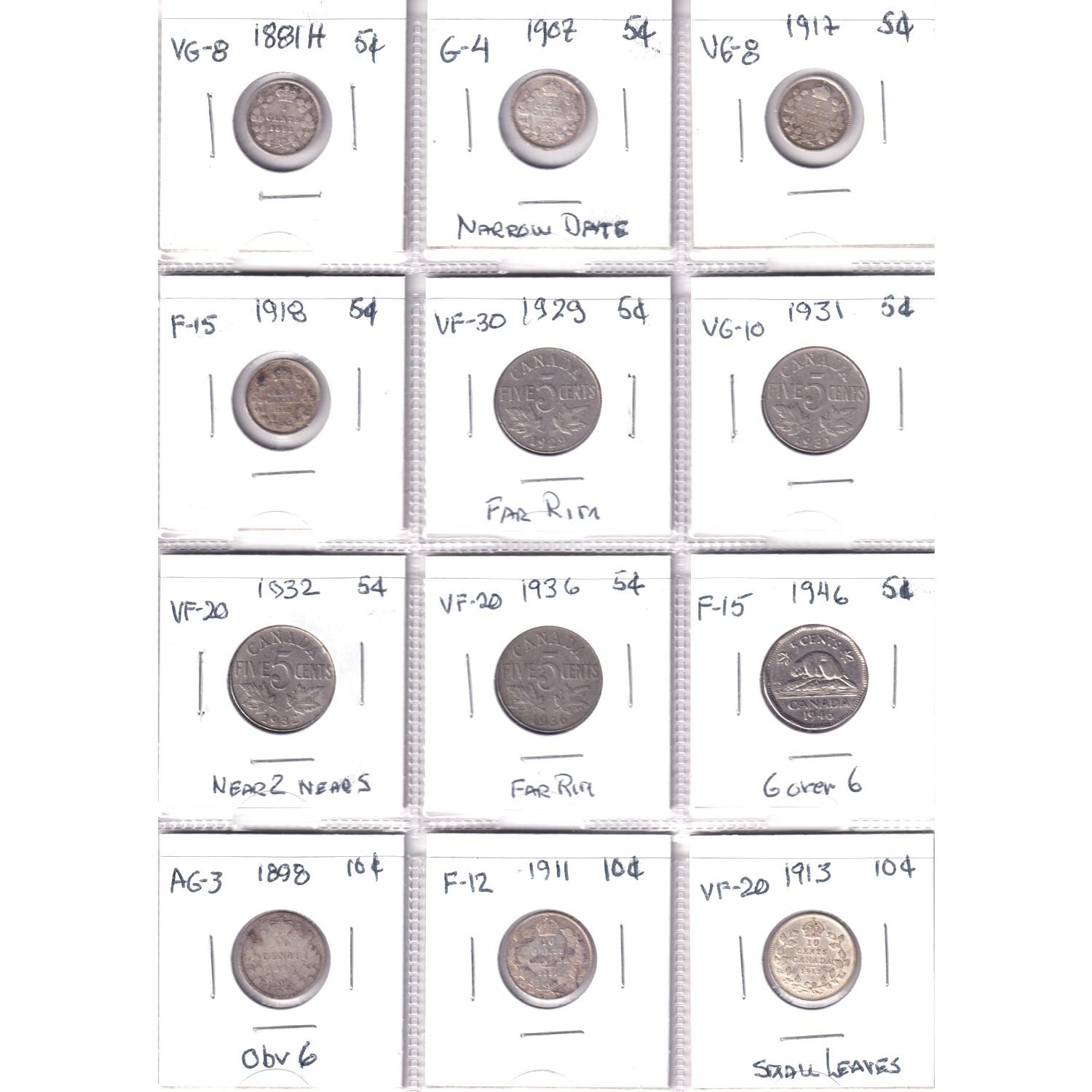 1881-1954 Canada 5-cent to 50-cent coins: Lot Includes: 1881H 5c, 1907 ND 5c, 1917 5c, 1918 5c, 1929 Far Rim 5c, 1931, 1932 N2 and NS 5c, 1936 Far Rim 5c, 1946 6 over 6 5c, 1898 10c, 1911 10c, 1913 Small Leaves 10c, 1919 10c, 1934 10c, 1947 Maple Leaf 10c, 1947 Maple Leaf 10c, 1950 10c, 1966 10c, 1912 25c, 1917 25c, 1930 25c, 1931 25c, 1944 Far 4 50c & 1954 50-cent. 24pcs