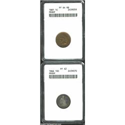1881 1C Cent PR64 Red and Brown ANACS, bright orange and lilac colors, well struck, a couple of small gray spots above the portrait; and an 1866 Dime PR62 ANACS, vivid lemon-gold and violet patina, boldly struck, attractive despite upper obverse hairlines. 2 coins Important notice: We expect to be auctioning lots at the rate of 200-250 per hour. Sometimes eBay Premier live bid software cannot keep up with that pace, so we strongly recommend that you place a realistic proxy bid now as insurance to avoid disappointment. Also please note that all Heritage/CAA lots purchased through eBay Premier carry a 20% Buyer's Premium. Please make sure you read the Terms and Conditions.