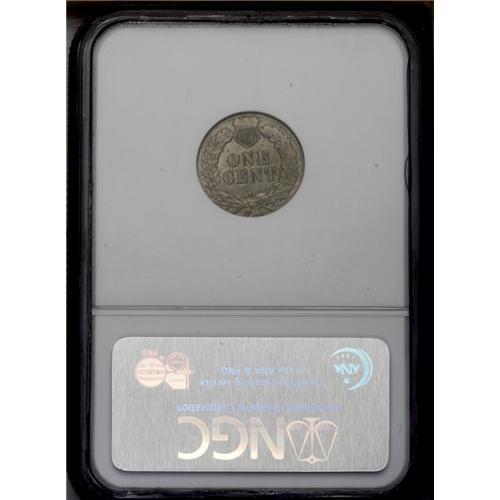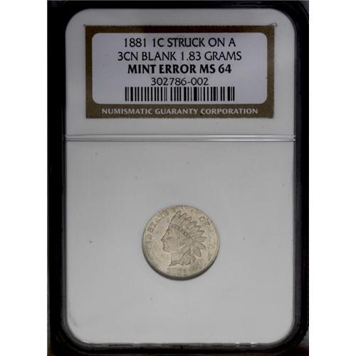 <B>1881<1C> Indian Cent--Struck on a Three Cent Nickel Blank--MS64 NGC.</B></I> 1.83 grams. The portrait is surprisingly sharp aside from the headdress tips, although the peripheral legends and the top of the shield are softly defined. The undersized three cent nickel planchet was too small to completely fill the dies. The grade is unusually high for a 19th century wrong planchet error. Lustrous and smooth with a few tan freckles on the reverse.