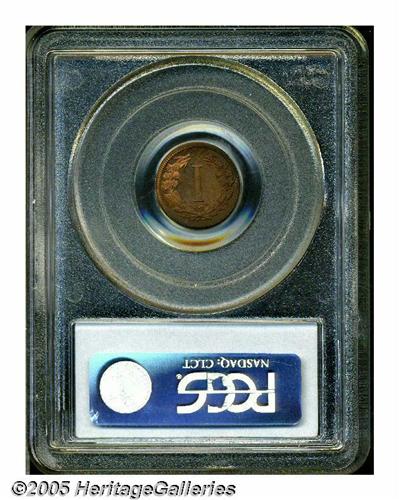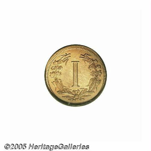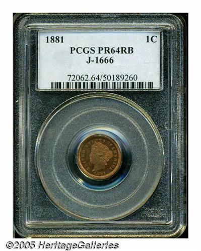 <B>1881<1C> Liberty Head One Cent, Judd-1666, Pollock-1866, High R.6, PR64 Red and Brown PCGS.</B></I> Charles Barber's Liberty nickel obverse is seen here on a diminutive one cent pattern. This same obverse was also used on three cent and five cent patterns from this year. The reverse is simply laid out with a Roman numeral I in the center, surrounded by a wreath of wheat and cotton. Struck in copper with a plain edge. This exactingly struck near-Gem is predominately light orange-gold in color, mellowed in deeper brown hues along the reverse border from 1 to 7 o'clock. A few miniscule carbon flecks prevent a higher numerical grade.