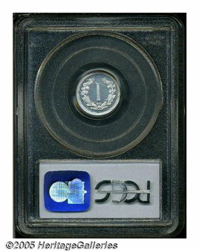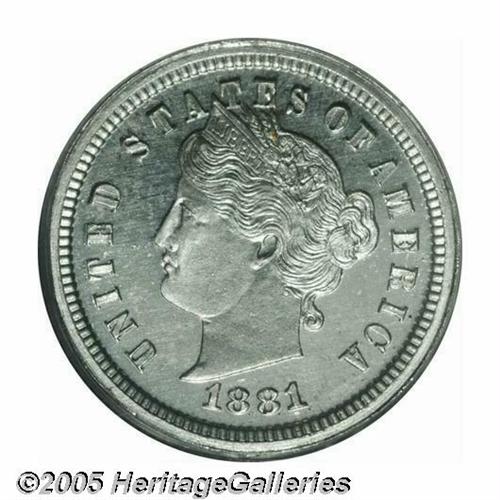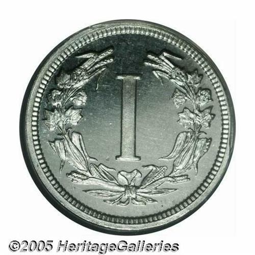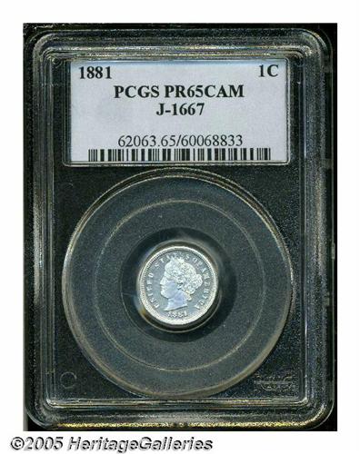 <B>1881<1C> Liberty Head One Cent, Judd-1667, Pollock-1867, Low R.7, PR65 Cameo PCGS.</B></I> Charles Barber's Liberty Nickel obverse is seen here on a One Cent pattern. This same obverse was also used on Three Cent and Five Cent patterns from this year. The reverse is simply laid out with a Roman numeral I in the center, surrounded by a wreath of wheat and cotton. Struck in aluminum with a plain edge. Good reflectivity is seen in the fields with a fully brilliant appearance on each side. The devices are lightly frosted yielding a moderate cameo effect as stated.<BR><I>From The Western Hills Collection.</B></I>
