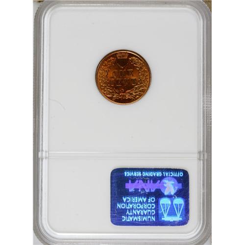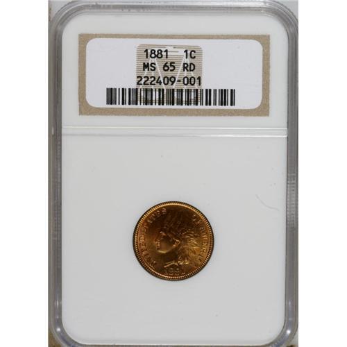 <B>1881 1C MS65 Red NGC.</B></I> This lustrous Gem is alive with crimson-orange color and richly frosted features. A boldly struck representative of this issue, with clear definition in all four diamonds. Census: 32 in 65 Red, 9 finer (2/07).<BR><BR><b>Shipping:</b> Coins & Currency (<a target="_blank" href="http://www.heritageauctions.com/common/shipping.php">view shipping information</a>)