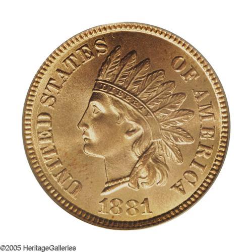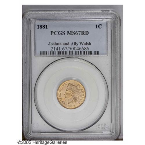 <B>1881<1C> MS67 Red PCGS.</B></I> This appears to have been struck from the Normal Dies. All 1881 cents show the final 81 tipped noticeably to the left. Snow asserts this was done to give the date a curved appearance even though a straight date punch was used. This is a one-of-a-kind coin. The surfaces are bright orange-red with a bit of lemony overtone on each side. Sharply struck, except at the top of the shield, there are no obvious or distracting carbon spots. Simply amazing quality. Population: 4 in 67, 0 finer (11/05).<BR><I>From The Joshua and Ally Walsh Collection of United States Cents.</B></I>
