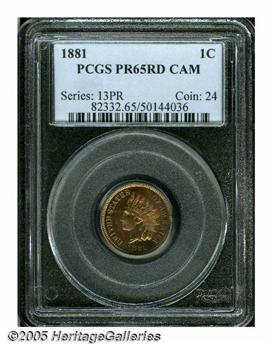 <B>1881<1C> PR65 Red Cameo PCGS.</B></I> Honey-gold and rose hues endow this intricately struck Gem. A small tick beneath the O in OF, otherwise the preservation is exemplary. Proof Indian Cents from the 1880s are not rare, but most have toned or spotted over the years. Population: 4 in 65 Red Cameo, 3 finer (5/05).