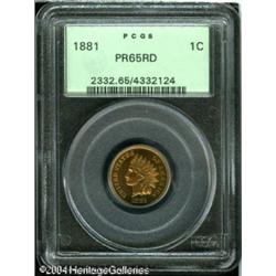 1881 1C PR65 Red PCGS. Beautiful copper-red colora <B>1881 1C PR65 Red PCGS.</B></I> Beautiful copper-red coloration adorns the fully struck, well preserved surfaces, that only show a couple of minor contact marks, and a pair of small dark spots, on the obverse. The reverse is spot-free and seems blemish-free. Population: 54 in 65, 27 finer (11/04). <BR><BR><B>Important notice:</B> Heritage usually auctions material at the rate of 200-250 lots per hour. On some occasions eBay Live bid software or the Internet may not be able to keep up with the pace of the auction. We recommend placing a realistic absentee bid now as insurance to avoid disappointment. Occasionally the auctioneer may eliminate or reject an eBay Live bid, and the auctioneer may also reopen a lot after the close of the eBay live bidding (usually because we missed an audience bid), and may reject your bid even if it shows you as the winning bidder. By bidding via eBay Live, you agree that Heritage may award the lot to another bidder at its sole discretion under the circumstances described above or any other reasonable circumstances. Since eBay bids are not shown to us until we open the lot on the floor, we treat those bids just like floor bids. In most cases the floor responds before the eBay bid is presented to us, due to Internet lag time, so for consistency we have made it a policy that floor bids are always considered first over tie eBay live bids. Also please note that all Heritage lots purchased through eBay Live carry a 20% Buyer's Premium. Please make sure you read the Terms and Conditions before you bid. This lot is being auctioned in conjunction with a live floor auction by Heritage Galleries & Auctioneers. All final auction and invoice information will be supplied by Heritage Galleries & Auctioneers, and all other information should be considered preliminary. Lot:5125