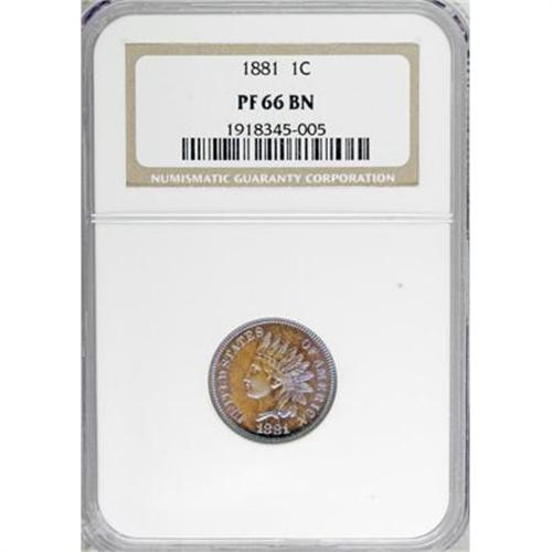 <B>1881 1C PR66 Brown NGC.</B></I> Lavish original toning adorns the well preserved surfaces of this impressive Premium Gem. All of the design elements are fully struck, and both sides of the piece are distraction-free. Census: 10 in 66 Brown, 3 finer (7/07). <BR><BR><B>Coin Engraver:</B> James B. Longacre<BR><BR><b>Shipping:</b> Coins & Currency (<a target="_blank" href="http://www.heritageauctions.com/common/shipping.php">view shipping information</a>)