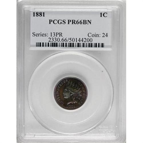 <B>1881 1C PR66 Brown PCGS.</B></I> A spectacular blend of lime-green, blue, magenta, violet, and mahogany patina is the prime attraction for this 1881 proof cent. Sharply detailed devices and exquisitely preserved fields only enhance the specimen's appeal. Population: 11 in 66 Brown, 0 finer (6/07).<BR><BR><B>Coin Engraver:</B> James B. Longacre<BR><BR><b>Shipping:</b> Coins & Currency (<a target="_blank" href="http://www.heritageauctions.com/common/shipping.php">view shipping information</a>\)