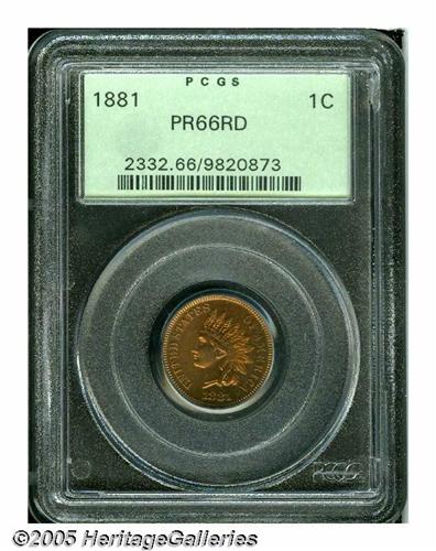 <B>1881<1C> PR66 Red PCGS.</B></I> Sharply struck on the motifs, with beautiful red-gold color over both sides. There are no apparent contact marks, but a few scattered flyspecks are noted on the reverse. As of March 2005, PCGS and NGC have certified only 35 specimens with this grade and color designation, and just six finer. Population: 23 in 66, 4 finer (3/05).