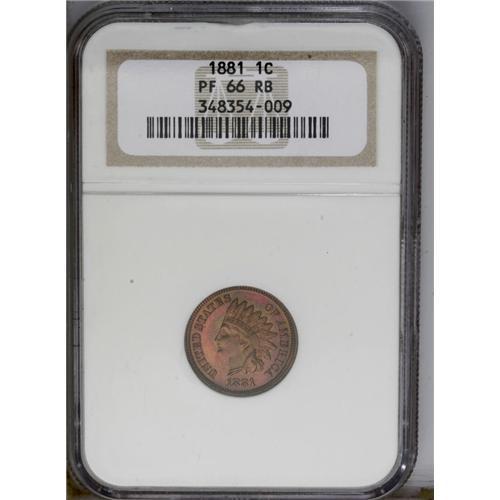 <B>1881<1C> PR66 Red and Brown NGC.</B></I> Crimson and yellow-gold patina is joined by lime-green accents on the obverse. Razor-sharp definition is noted on the design features. A couple of trivial marks on the Indian's cheek do not distract. Census: 37 in 66 Red and Brown, 6 finer (4/06).