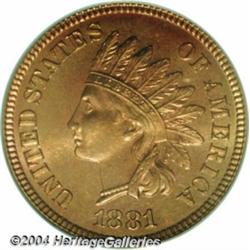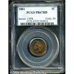 <B>1881<1C> PR67 Red PCGS.</B></I> Bright crimson and gold patination graces both the obverse and reverse. The design elements are sharply struck. A few tiny flecks occur on each side, but do not distract. Population: 4 in 67, 0 finer (7/04). <BR><BR><B>Important notice:</B> Heritage usually auctions material at the rate of 200-250 lots per hour. On some occasions eBay Live bid software or the Internet may not be able to keep up with the pace of the auction. We recommend placing a realistic absentee bid now as insurance to avoid disappointment. Occasionally the auctioneer may eliminate or reject an eBay Live bid, and the auctioneer may also reopen a lot after the close of the eBay live bidding (usually because we missed an audience bid), and may reject your bid even if it shows you as the winning bidder. By bidding via eBay Live, you agree that Heritage may award the lot to another bidder at its sole discretion under the circumstances described above or any other reasonable circumstances. Since eBay bids are not shown to us until we open the lot on the floor, we treat those bids just like floor bids. In most cases the floor responds before the eBay bid is presented to us, due to Internet lag time, so for consistency we have made it a policy that floor bids are always considered first over tie eBay live bids. Also please note that all Heritage lots purchased through eBay Live carry a 20% Buyer's Premium. Please make sure you read the Terms and Conditions before you bid. </span></font></tr></table></td></tr></table>