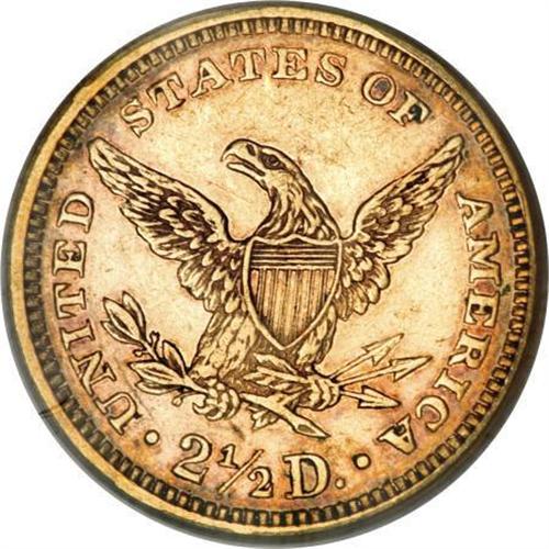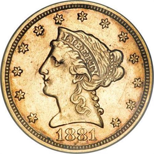 <B>1881 $2 1/2 AU50 PCGS.</B></I> Deep russet hues add character to the bright surfaces of this boldly struck and well-detailed example. One of the premier rarities in the series with an extremely low business strike mintage of just 641 pieces, along with 51 proofs. The few known survivors are invariably prooflike and often well circulated. Hints of the once prooflike surfaces are seen in the protected areas as is a bit of verdigris at the lower portion of the reverse. A fully pleasing example of this coveted issue.<BR><BR><B>Coin Engraver:</B> Christian Gobrecht<BR><BR><b>Shipping:</b> Coins & Currency (<a target="_blank" href="http://www.heritageauctions.com/common/shipping.php">view shipping information</a>)