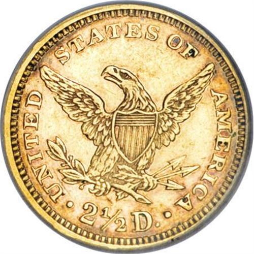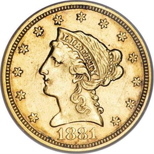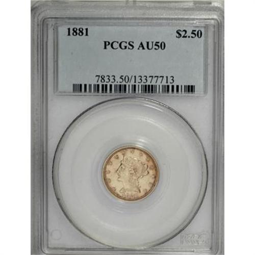 <B>1881 $2 1/2 AU50 PCGS.</B></I> Deep russet hues add character to the bright surfaces of this boldly struck and well-detailed example. One of the premier rarities in the series with an extremely low business strike mintage of just 641 pieces, along with 51 proofs. The few known survivors are invariably prooflike and often well circulated. Hints of the once-prooflike surfaces are seen in the protected areas as is a bit of verdigris at the lower portion of the reverse. A fully pleasing example of this coveted issue.<BR><BR><B>Coin Engraver:</B> Christian Gobrecht<BR><BR><b>Shipping:</b> Coins & Currency (<a target="_blank" href="http://www.heritageauctions.com/common/shipping.php">view shipping information</a>)