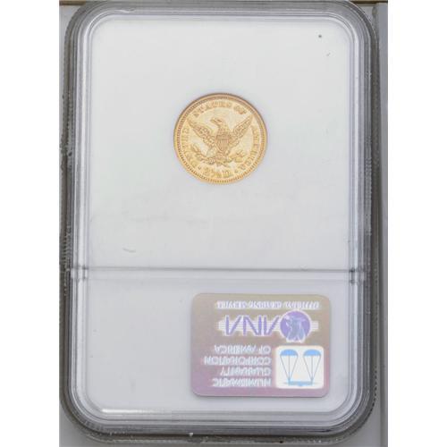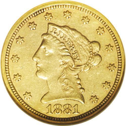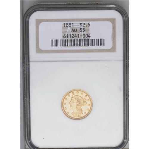 <B>1881<$2 1/2> AU55 NGC.</B></I> One of the premier rarities in the series of Liberty Head quarter eagles, the 1881 boasts a miniscule business strike mintage of just 641 pieces, and 51 proofs. The few known survivors are invariably prooflike and a surprising percentage come well circulated. This piece exhibits still reflective fields that tend to exaggerate the contact marks that have accumulated from a short time in the channels of commerce. The most noticeable ones are an abrasion on Liberty's cheek, and a couple of marks above the eagle in the reverse field. Pleasing reddish-golden color overall.
