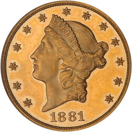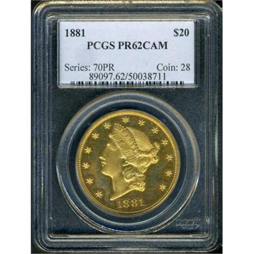 <b>1881 $20 Liberty. PCGS graded PF62 CAM.</b> Pop: 1/0. An impressive specimen both physically and aesthetically. The geologic weight of the frosted head of Liberty is surrounded by equally stunning molten mirror fields on either side making the devices look as though they are islands floating on a lake, so smooth is the surrounding field. A beautiful Proof 62 in other words, one with such contrast that NGC deemed it "Cameo." Just 61 Proof 1881 double eagles were struck, and the years have not been kind to that mintage. Perhaps as few as 15 to 20 or so Proofs of the date can be found today, but some of those are notably impaired by "hay marks" and other distractions. Not so the present coin. We expect strong bidding activity for the present lot, and rightfully so. This coin is set in PCGS holder 50038711.