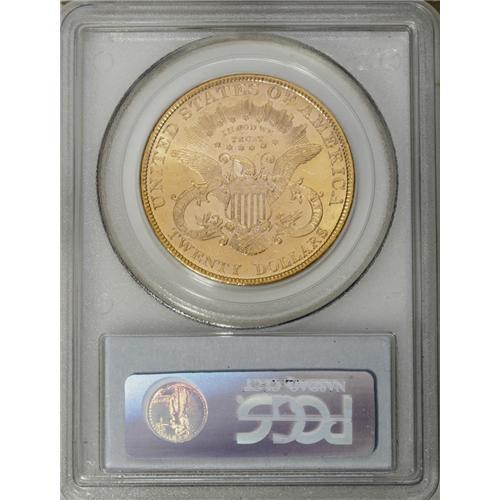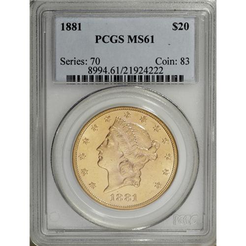 <B>1881 $20 MS61 PCGS.</B></I> The 1881 double eagle commences what David Akers refers to as a "run of seven ultra low mintage issues from the Philadelphia Mint." Business strike production of a mere 2,199 pieces provides the first ingredient for rarity and the fact that few were spared from the ravages of commerce secures its place among the most challenging Liberty twenties. Of the 35-40 pieces believed to survive, only a small handful qualifies as Mint State. Although Heritage Signature Auctions have long been a prime source of rare date gold, nearly six years lapsed between the only other two Uncirculated we have offered, a PCGS MS60 in our 1998 ANA Sale (which may now reside in an MS61 holder since the current combined MS60 population is zero) and a PCGS MS61 selling in our June 2004 Long Beach Sale for $57,500.<BR> This important Uncirculated representative is a bit more reflective than the other two Mint State pieces sold over the past decade, not surprising since so few 1881 twenties were originally produced. Abrasions are fairly plentiful in the obverse fields, but are not particularly bothersome on the portrait and are a bit less numerous and even distributed over the reverse. With interest in "blue chip" gold coins such as this at an all-time high, we feel confident that this low mintage gold rarity in unsurpassable condition could reach a record price level. Population: 2 in 61, 0 finer (11/06).<BR><I>From The Kutasi Collection.</B></I><BR><BR><b>Shipping:</b> Coin/Currency (<a target="_blank" href="http://www.heritageauctions.com/common/shipping.php">view shipping information</a>)