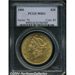 <B>1881<$20> MS61 PCGS.</B></I> Only 2,220 circulation strike 1881 double eagles were produced. Approximately 25-35 pieces are known today with most of these grading XF40 to AU50. In the middle to higher AU grades, the 1881 is extremely rare and the only pieces to have been encapsulated as Uncirculated (as of March 2004) are the PCGS MS60 that we auctioned for $29,235 in our 1997 ANA Sale and this specimen, the finest known to either service.<BR> Recent sales records include an example cataloged as "Brilliant Uncirculated" in the October 2001 Dallas Bank Collection Sale which brought $21,850, a PCGS AU50 that realized $14,950 in our February 2001 Long Beach Sale, and a PCGS AU55 that garnered $14,950 in the October 1999 Bass II Sale. Considering the unquestioned rarity of this issue (and the great popularity of this series), it remains extremely undervalued in our opinion.<BR> The surfaces of this piece are unquestionably original with a bit of the "dirty gold" appearance seen on so many Double Eagles from this era. Probably struck from a later state of the dies, there is little evidence of the original prooflike finish in the fields--a trait seen on all Twenties of this issue to one degree or another. Well struck, numerous small and medium sized contact marks litter the surfaces, these being the grade-limiting factors. A very special opportunity for the advanced U.S. gold enthusiast. <BR><BR><B>Important notice:</B> Heritage usually auctions material at the rate of 200-250 lots per hour. On some occasions eBay Live bid software or the Internet may not be able to keep up with the pace of the auction. We recommend placing a realistic absentee bid now as insurance to avoid disappointment. Occasionally the auctioneer may eliminate or reject an eBay Live bid, and the auctioneer may also reopen a lot after the close of the eBay live bidding (usually because we missed an audience bid), and may reject your bid even if it shows you as the winning bidder. By bidding via eBay Live, you agree that Heritage may award the lot to another bidder at its sole discretion under the circumstances described above or any other reasonable circumstances. Since eBay bids are not shown to us until we open the lot on the floor, we treat those bids just like floor bids. In most cases the floor responds before the eBay bid is presented to us, due to Internet lag time, so for consistency we have made it a policy that floor bids are always considered first over tie eBay live bids. Also please note that all Heritage lots purchased through eBay Live carry a 20% Buyer's Premium. Please make sure you read the Terms and Conditions before you bid.