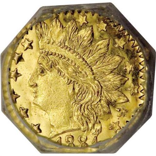 <B>1881 25C Indian Octagonal 25 Cents, BG-799O, Low R.4, MS66 Deep Mirror Prooflike NGC.</B></I> Luminous devices rise above the glassy fields to provide exceptional eye appeal. Essentially as made, and flawless save for a small strike-through near the chin and an occasional hint of incompleteness on the lower portion of the wreath. Census: 2 in 66 Deep Mirror Prooflike, 1 finer (9/07).<BR><BR><b>Shipping:</b> Coins & Currency (<a target="_blank" href="http://www.heritageauctions.com/common/shipping.php">view shipping information</a>)