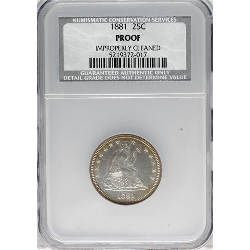 1881 25C --Improperly Cleaned--NCS. Proof. NGC Cens