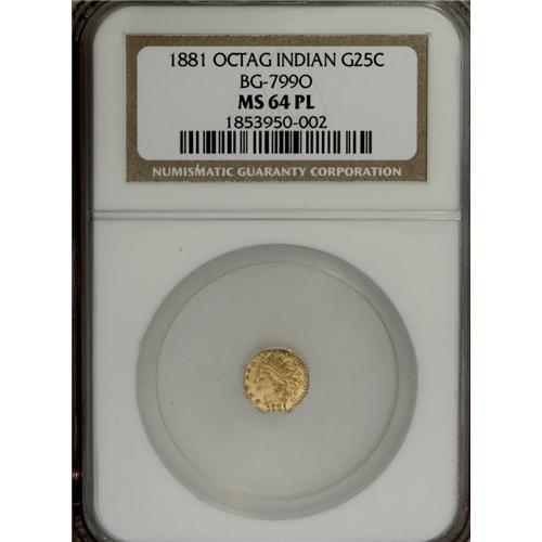<B>1881 25C Indian Octagonal 25 Cents, BG-799O, Low R.4, MS64 Prooflike NGC.</B></I> Brightly mirrored fields and meticulously struck devices ensure the eye appeal of this Period Two near-Gem. The reverse field is lightly striated.<BR><BR><b>Shipping:</b> Coins & Currency (<a target="_blank" href="http://www.heritageauctions.com/common/shipping.php">view shipping information</a>)