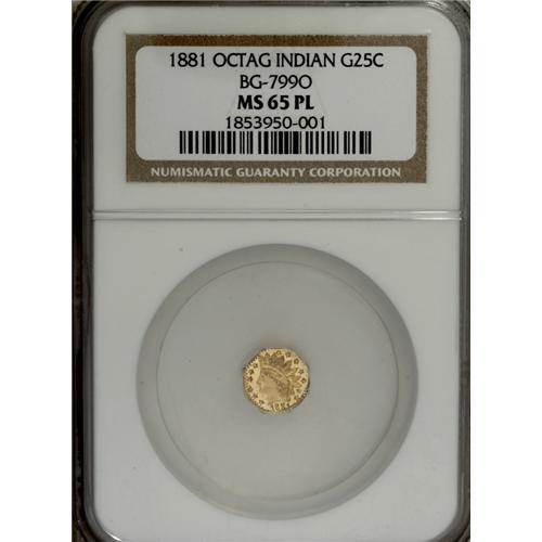 <B>1881 25C Indian Octagonal 25 Cents, BG-799O, Low R.4, MS65 Prooflike NGC.</B></I> This flashy yellow-gold Gem is well struck aside from a couple of berries within the wreath. Census: 4 in 65 Prooflike, 1 finer (1/07).<BR><BR><b>Shipping:</b> Coins & Currency (<a target="_blank" href="http://www.heritageauctions.com/common/shipping.php">view shipping information</a>)