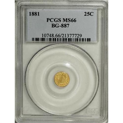 <B>1881 25C Indian Round 25 Cents, BG-887, R.3, MS66 PCGS.</B></I> A flashy high grade California small denomination gold piece. The honey-gold fields are prooflike and unabraded. Crisply struck and attractive. Population: 3 in 66, 0 finer (8/07).<BR><BR><b>Shipping:</b> Coins & Currency (<a target="_blank" href="http://www.heritageauctions.com/common/shipping.php">view shipping information</a>)