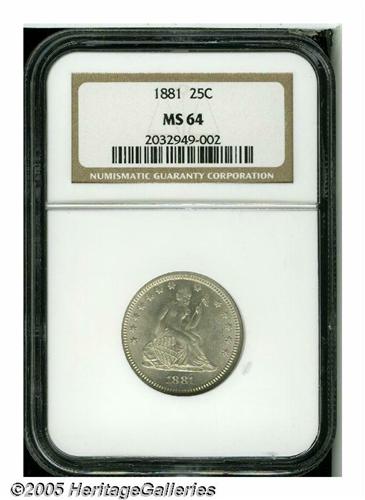 <B>1881<25C> MS64 NGC.</B></I> Business strike Quarter production amounted to just 12,000 pieces in 1881, all of which were struck in the Philadelphia mint. This piece displays adequately struck devices, though some of the star centers are weak. The frosty surfaces look white at first glance, but further inspection reveals wisps of light brown color, especially on the reverse. A few minute handling marks are noted in the fields of each side.