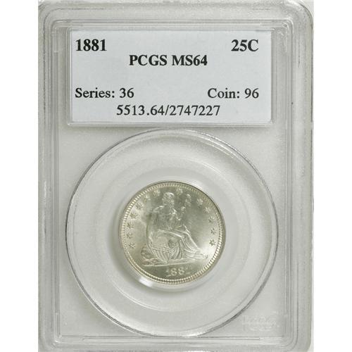 <B>1881 25C MS64 PCGS.</B></I> High grade Seated quarters from the 1880s are more likely proofs than business strikes, with the latter generally encountered in circulated grades when encountered at all. This piece has frosty silver luster with no trace of toning on either side. It is sharply struck with pristine surfaces.<BR><BR><b>Shipping:</b> Coins & Currency (<a target="_blank" href="http://www.heritageauctions.com/common/shipping.php">view shipping information</a>)
