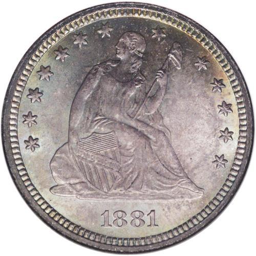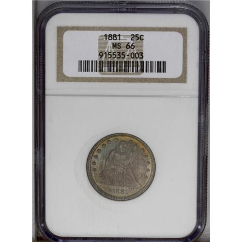 1881 25C MS66 NGC. Orange, dove-gray, and lime iridesc