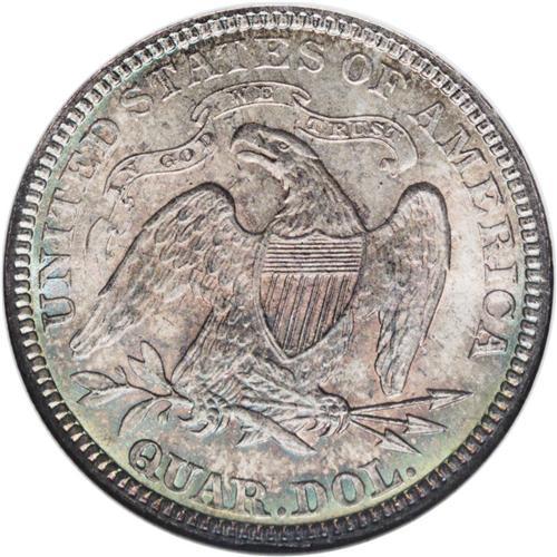 <B>1881<25C> MS66 NGC.</B></I> Orange, dove-gray, and lime iridescence embrace this satiny and unusually mark-free Premium Gem. A few of the upper left stars are soft, but the major devices are penetratingly struck. The vertical shield stripes are lightly die doubled. Only 12,000 pieces were struck. Census: 12 in 66, 8 finer (9/06).