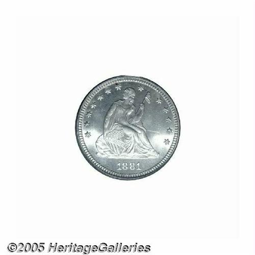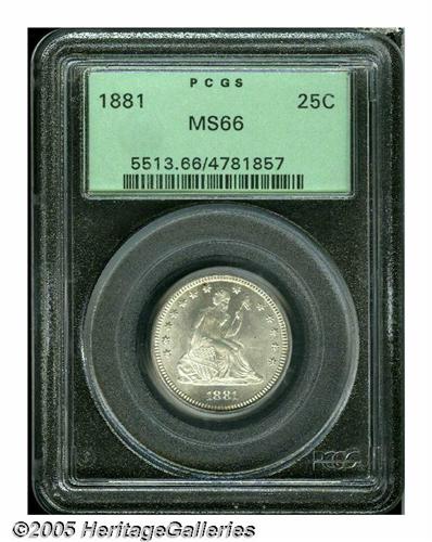 <B>1881<25C> MS66 PCGS.</B></I> Business strike Quarter production amounted to just 12,000 pieces in 1881, all of which were struck in the Philadelphia mint. This is an immensely popular issue among specialists, and the present Gem is certainly among the finest coins extant. This is a smooth looking example whose surfaces are devoid of toning with an ice-white appearance. The finish is noticeably satiny with bright fields in evidence on both sides. With the exception of several of the star centrils, the strike has brought forth sharp definition over all design elements. An attractive coin in all regards. Population: 13 in 66, 3 finer (6/05).