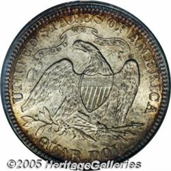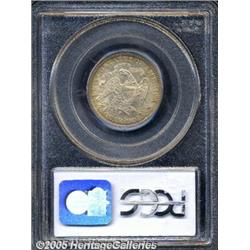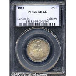 <B>1881 25C MS66 PCGS.</B></I> Stars six through eight are incomplete, otherwise the strike is imposing, and the fully lustrous surfaces are enveloped in light honey-gold and sky-gray toning that gradually deepens slightly at the reverse border. In addition to its glorious eye appeal, this lovely premium Gem is also well preserved. The reverse is essentially immaculate. A scarce, low mintage (12,000 business strikes) issue that appears less frequently in Mint State than in proof. Population: 11 in 66, 3 finer (2/04).