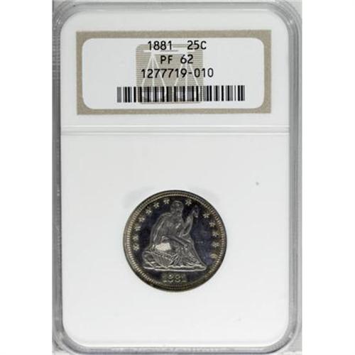 <B>1881 25C PR62 NGC.</B></I> NGC Census: (14/196). PCGS Population (49/181). Mintage: 975. Numismedia Wsl. Price for NGC/PCGS coin in PR62: $333. (#5582)<BR><BR><B>Coin Engraver:</B> Christian Gobrecht<BR><BR><b>Shipping:</b> Coins & Currency (<a target="_blank" href="http://www.heritageauctions.com/common/shipping.php">view shipping information</a>\)