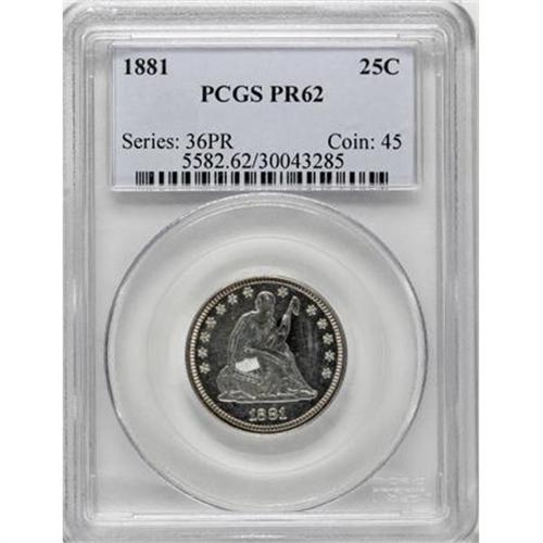 <B>1881 25C PR62 PCGS.</B></I> PCGS Population (51/182). NGC Census: (15/198). Mintage: 975. Numismedia Wsl. Price for NGC/PCGS coin in PR62: $333. (#5582)<BR><BR><B>Coin Engraver:</B> Christian Gobrecht<BR><BR><b>Shipping:</b> Coins & Currency (<a target="_blank" href="http://www.heritageauctions.com/common/shipping.php">view shipping information</a>)