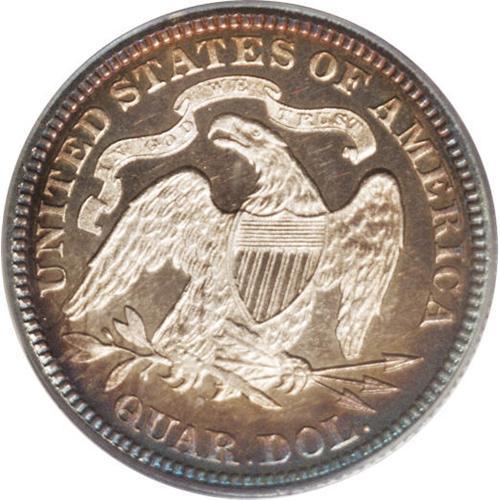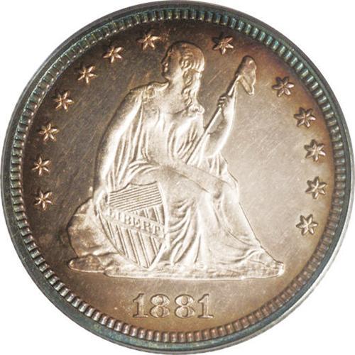 <B>1881<25C> PR64 Cameo PCGS.</B></I> The 8s in the date are lightly repunched within the loops. The borders have purple, magenta, gold, and cobalt-blue patina, while the central regions are bright and essentially untoned. The strike is razor sharp. The obverse field has a few wispy hairlines that preclude a higher grade. Just 975 proofs were struck.