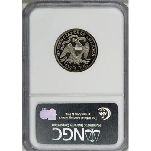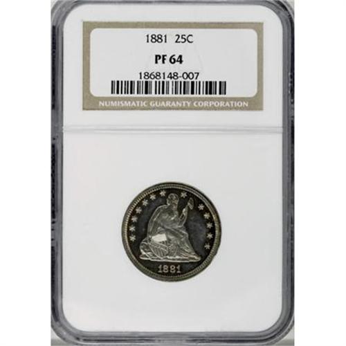 <B>1881 25C PR64 NGC.</B></I> Though not noted on the holder, both sides of this Choice Proof display appreciable contrast. Patches of blue and orange peripheral toning surround the minimally patinated inner fields. One of just 975 specimens struck.<BR><BR><B>Coin Engraver:</B> Christian Gobrecht<BR><BR><b>Shipping:</b> Coins & Currency (<a target="_blank" href="http://www.heritageauctions.com/common/shipping.php">view shipping information</a>)